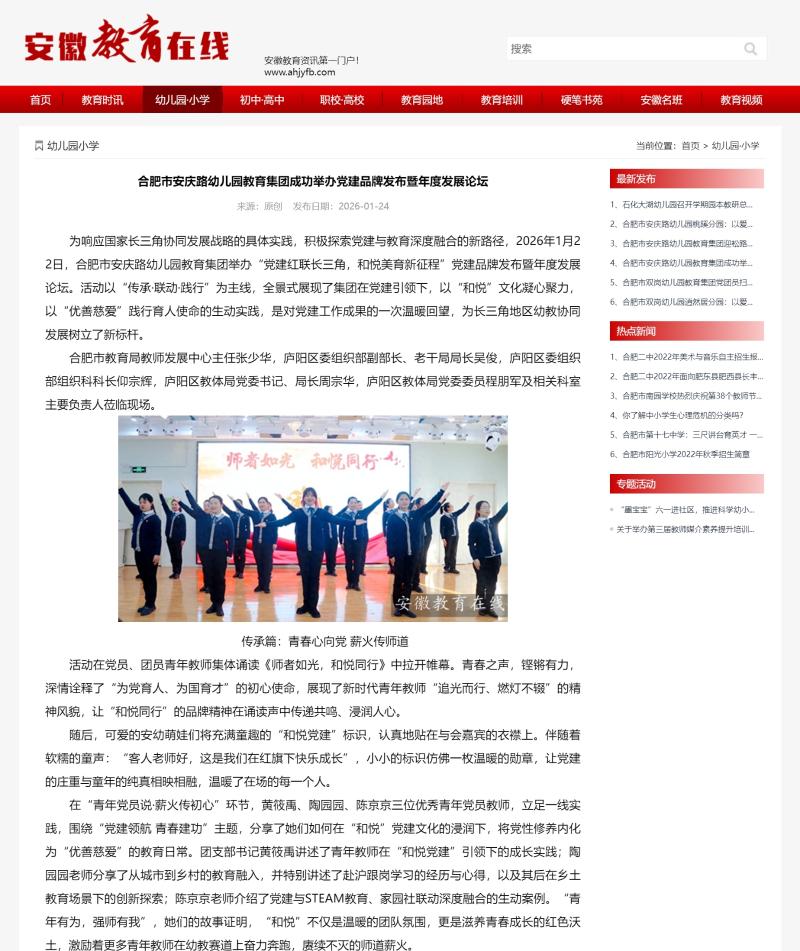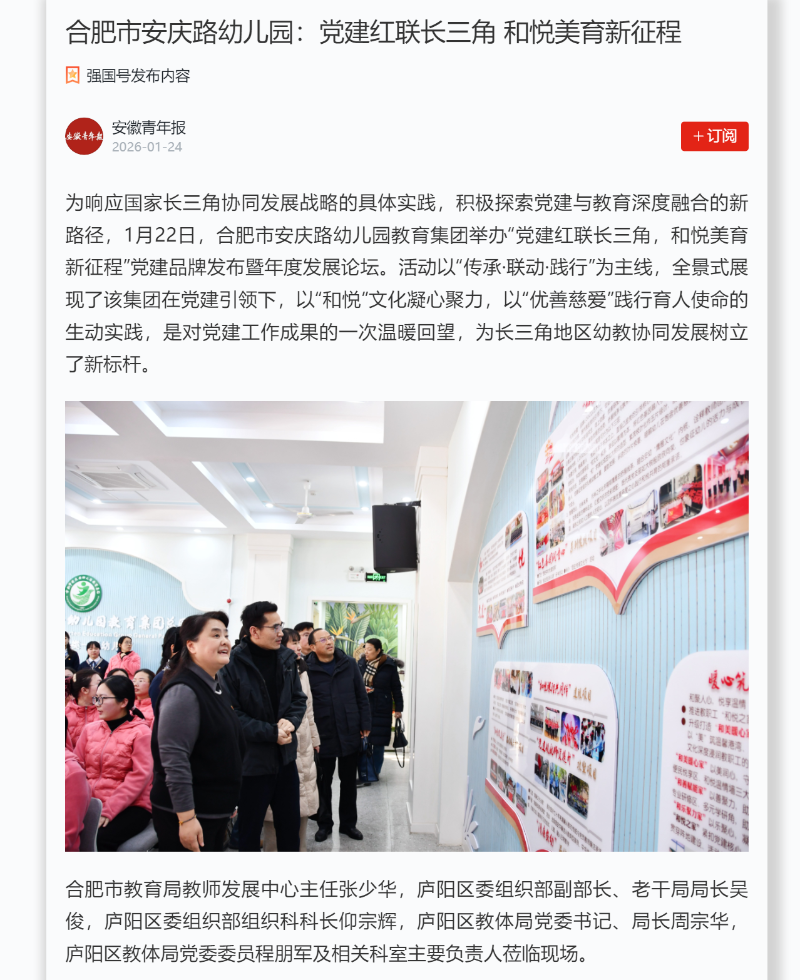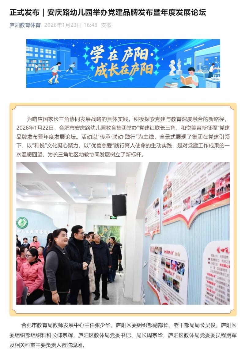 此次论坛圆满落幕,既回望了党建工作成果,更开启了“和悦”品牌发展新起点。《学习强国》《中国网》《安青网》及视频号、《安徽教育在线》《庐阳发布》《庐阳教育体育》微信公众号等多家主流媒体联合报道安庆路幼儿园教育集团成功举办党建品牌发布暨年度发展论坛活动。