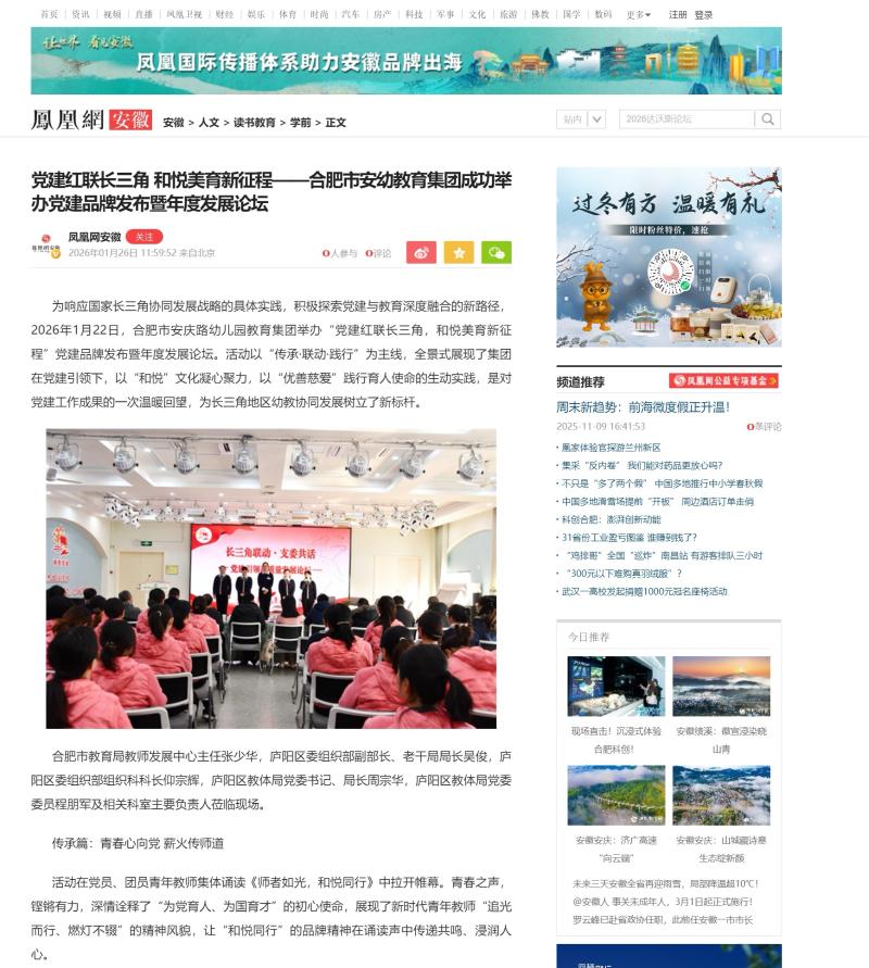 为响应国家长三角协同发展战略的具体实践,积极探索党建与教育深度融合的新路径,2026年1月22日,合肥市安庆路幼儿园教育集团举办“党建红联长三角,和悦美育新征程”党建品牌发布暨年度发展论坛。活动以“传承·联动·践行”为主线,全景式展现了集团在党建引领下,以“和悦”文化凝心聚力,以“优善慈爱”践行育人使命的生动实践,是对党建工作成果的一次温暖回望,为长三角地区幼教协同发展树立了新标杆。