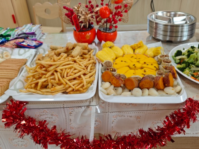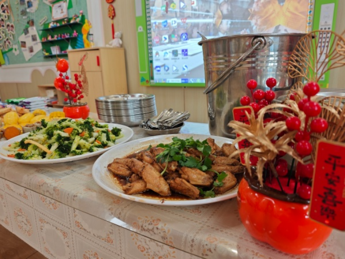 年的味道,离不开幕后辛勤的守护。幼儿园食堂将新年祝福融入每道菜肴。“展翅高飞”鸡翅寓意新的一年飞跃成长,“金玉满堂”春卷象征富足美满,“节节高升”黄金米糕寄托进步向上的美好愿望。工作人员们早早规划,从清晨的精心备料,到火候的精准把控,每一道工序都倾注着爱与匠心。他们用安全、健康、美味的食材,为孩子们编织了一席充满祝福的新年味觉盛宴,守护着孩子们“舌尖上的年味”。