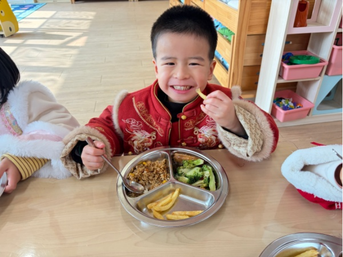 用餐时刻,教室变成了温馨喜庆的“家庭团圆宴”。孩子们品尝着美味的食物,分享着彼此的喜悦。“这个鸡翅真好吃!”“我吃了‘步步高’!”童言稚语中满是满足。老师们也化身“新年使者”,为孩子们讲述美食背后的美好寓意。美食与故事交融,味蕾与心灵共暖,欢声笑语汇聚成最动人的新年乐章,孩子们在共享中感受到集体的温暖与节日的欢腾。