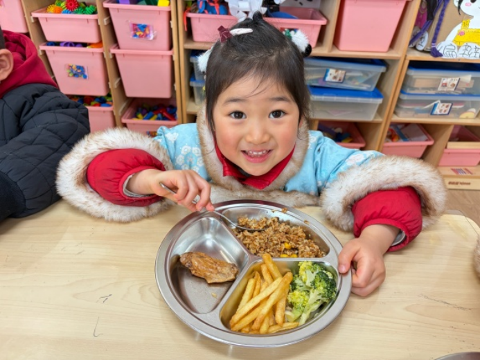 取餐环节,成为孩子们践行传统礼仪的生动课堂。在“新年好”的轻柔音乐中,孩子们化身为谦恭有礼的“小宾客”,手持餐盘,井然有序地排队。他们学习耐心等待,轻声交流,互相礼让。在“吃多少,取多少,不浪费”的温馨提醒下,孩子们认真估量自己的食量,自主选择。