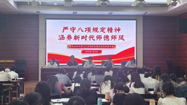 2025年7月3日上午,合肥市南门小学湖畔花园分校在四楼会议室召开全体教师大会,围绕校本教研深化、思想政治教育等内容展开专题学习与动员部署。会议由钱朝阳副校长主持,全体教职工参会。