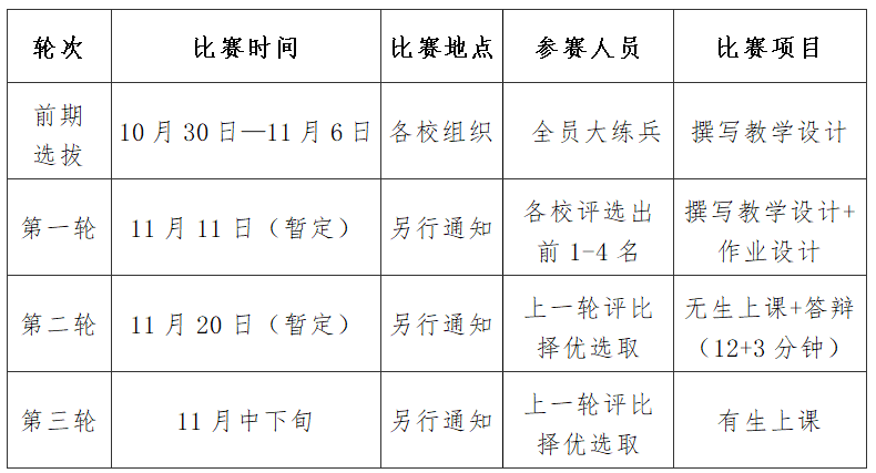 10月30日—11月6日,各校自行组织全体道德与法治教师进行全员大练兵,撰写教学设计。11月8日前,各校根据校内选拔结果报送前1-4名教师名单进入区内第一轮比赛。