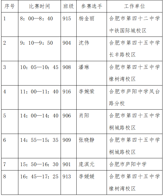 为了更好地开展庐阳区第十二届中小学初中化学学科课堂教学评比,经过第一轮说课+答辩比赛,现有8位参赛选手进入决赛,现将此次赛事决赛的有关事项通知如下: