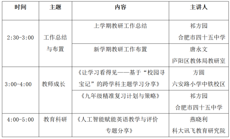 为更好地落实新课程新课标新教材理念,明确新学期中小学英语学科教研工作思路,推进各校教研活动有序开展,助力全区教育教学水平的提升和义务教育优质均衡发展,经研究决定召开庐阳区中小学英语教研工作会议。具体安排如下: