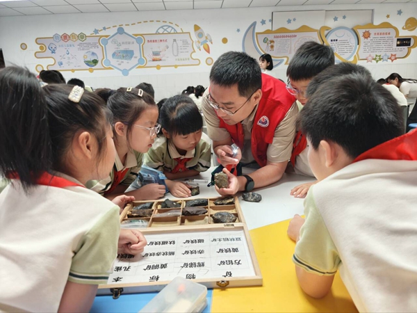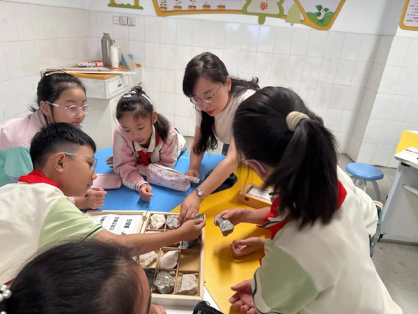 最让孩子们兴奋的环节,是岩石标本互动观察。徐娟带来了花岗岩、大理石、石英石等20余种珍贵岩石标本。孩子们按捺不住好奇,有序上前触摸、观察,有的对着标本里的晶体结构啧啧称奇,有的认真比对不同岩石的纹理差异。“老师,这块石头为什么闪闪发光?”“大理石真的能用来盖房子吗?”面对孩子们天马行空的提问,徐娟耐心细致地逐一解答,用专业知识为孩子们搭建起通往地质世界的桥梁,并鼓励孩子们:“每一块岩石都藏着地球的秘密,希望大家保持对自然的好奇,未来用科学的眼睛探索更多未知。”
