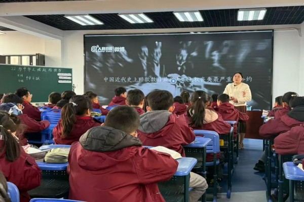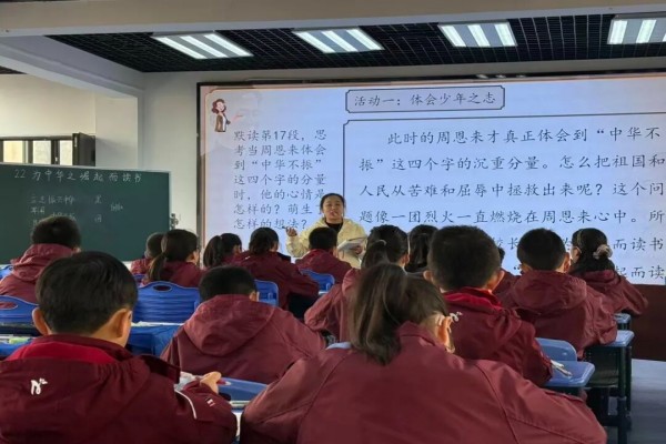 虞敬文老师的课堂则稳扎稳打,她首先帮助学生搭建清晰的历史背景框架,进而通过指名读、集体品读等方式,层层深入地引导学生咀嚼关键语句,体会“崛起”二字的分量与志向的崇高,激发学生的爱国情与报国志。