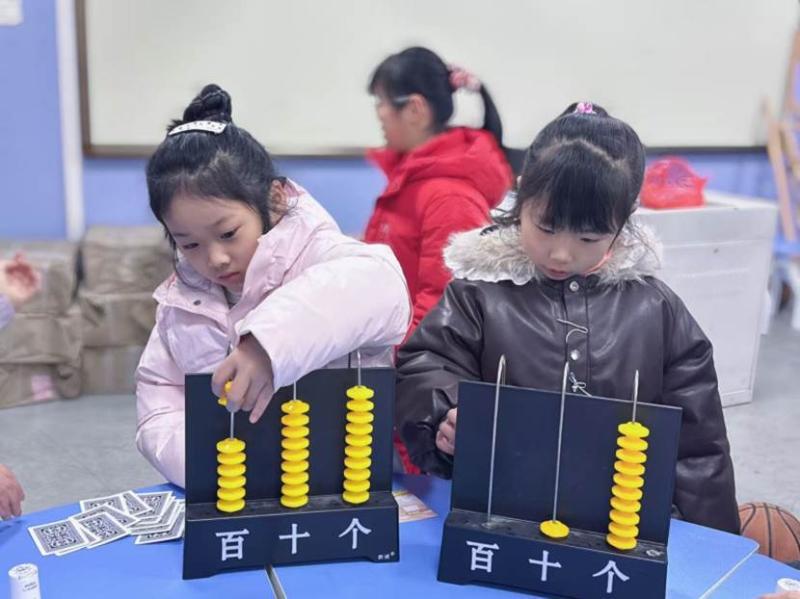 第一关“数学好用”,同学们化身“数字小达人”,从数字卡片盒中随机抽取数字,用篮球拍出对应数量后,再用计数器拨出数字并清晰说出数的组成。这一环节将数学思维与体育动作巧妙结合,让学生在拍球的动感中理解数的概念,不仅锻炼了手眼协调能力,更在趣味挑战中提升了数学应用意识,收获满满的成就感。