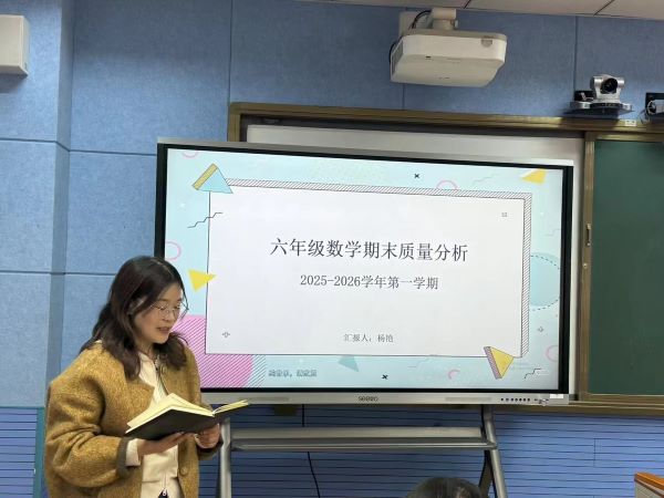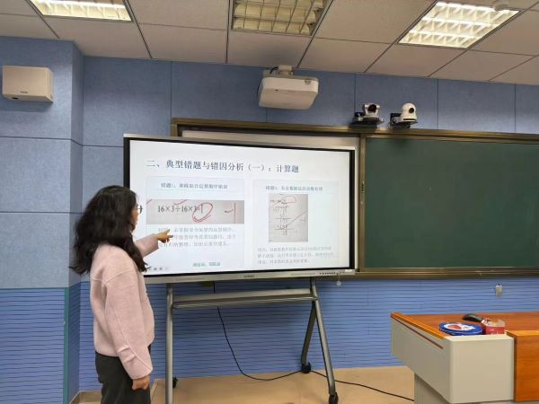 会上,各年级组基于数据深入剖析学情教情,三年级龚盈老师聚焦中年级过渡阶段特点,分析计算能力、审题习惯等薄弱环节,提出夯实计算基础、培养良好学习习惯等举措;四年级宋竞峥老师锚定命题方向,结合检测数据对比,对于学生的计算训练、检查方法等进行分享;五年级姚燕老师针对高年级思维培养和知识衔接,强调分层辅导与错题管理;六年级杨艳老师立足毕业班学情,从试题中得到启发,并强调了习惯的重要性,从而在精准复习、答题规划等方面交流经验。