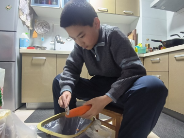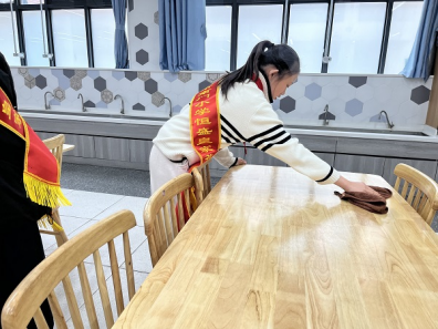 中午时分,阳光透过食堂的玻璃窗,洒在一张张稚嫩而认真的脸庞上。六年级的“帮厨小志愿者们”准时出现在学校食堂。他们在食堂阿姨的指导下,开始了忙碌而有序的劳动。擦拭餐桌的小组最先行动起来。抹布蘸水,拧干,然后一下一下划过桌面。油渍遇水而化,饭粒应声落盘,原本斑驳的桌面渐渐显露出原本的光洁。六(6)班的谭同学俯身弯腰,连桌沿缝隙都不放过,额头渗出细密的汗珠,却顾不上擦拭。“阿姨每天要擦多少张桌子?”他直起腰,轻声问身旁的值班老师。老师没有回答,只是指了指食堂里整齐排列的近百张餐桌。谭同学愣了一下,随即低头,继续手中的动作,比方才更加认真。清扫地面的小组穿梭于餐桌之间。扫帚划过地面,残渣聚拢成堆,簸箕轻铲而入。
