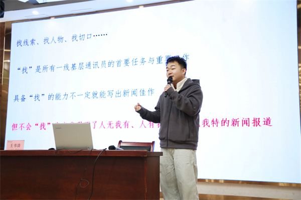 培训中,王书浒记者结合自身多年一线采编经验,以“找线索、找人物、找切口”为核心,深入浅出讲解了校园新闻线索挖掘、亮点提炼与内容呈现的实用技巧。他立足校园宣传实际,强调要以小切口展现大主题、以小故事诠释大情怀,倡导宣传工作坚持“人无我有、人有我优、人优我特”的精品意识,为参训教师带来了一堂内容充实、操作性强的专业辅导课,有效提升了大家的新闻敏感度与宣传业务素养。