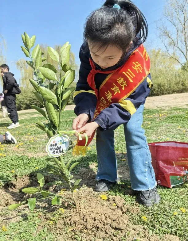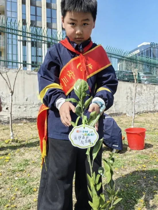 阳光下,新栽的小树苗昂首挺立、生机勃勃。孩子们小心翼翼地将写满心愿与祝福的许愿卡挂在枝头,家长们则用镜头记录下这一美好瞬间,让绿色希望与成长梦想在春风中一同飞扬。植树结束后,孩子们又化身“小小园丁”,在老师和家长的指导下,细心为小树浇水、培土、除草,一同挂上专属养护标识,约定好共同守护这片新绿,以实际行动践行“绿水青山就是金山银山”的绿色发展理念,也让“美化心灵”的要求在实践中深化。