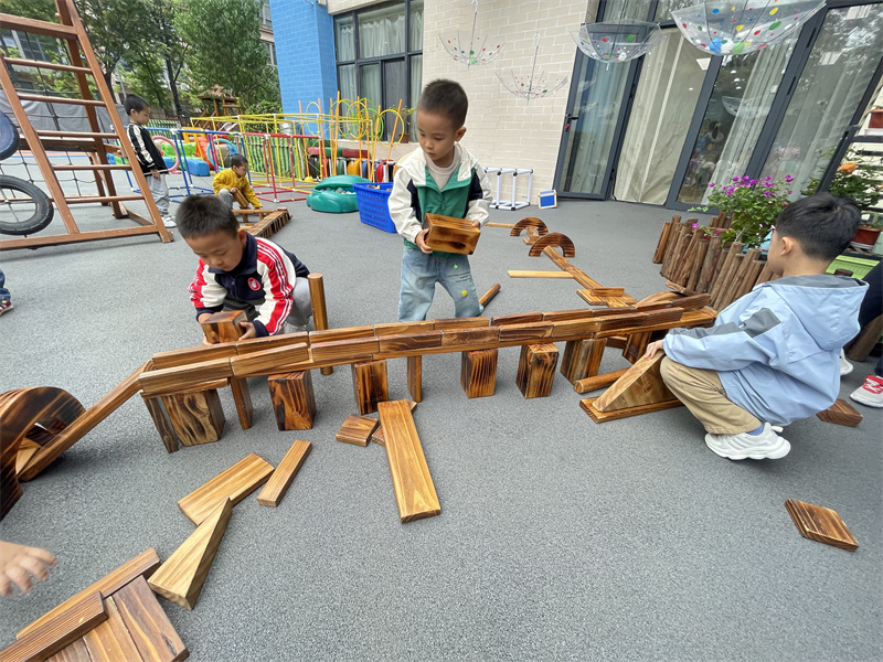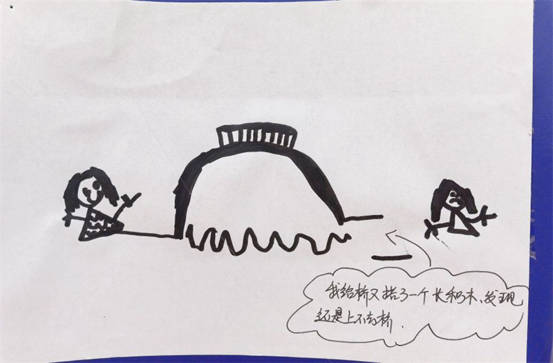有的用大积木做桥墩,稳稳撑起长木板当桥面;有的小组搭了“拱桥”,说这样更像公园的石桥;还有的增设“护栏”设计,保障“通行安全”。