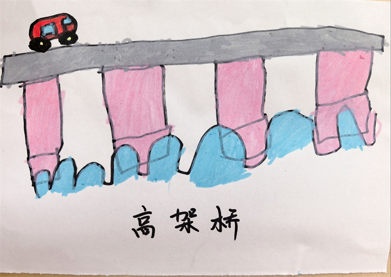 建构活动结束后,幼儿用画笔勾勒“理想桥”:“彩虹桥面的桥”“多桥墩稳固桥”“可容纳汽车、自行车和行人的多功能桥”。一幅幅充满想象力的设计图,不仅展现了幼儿对桥梁结构的理解,更彰显了他们的创造力与对未来的美好构想。