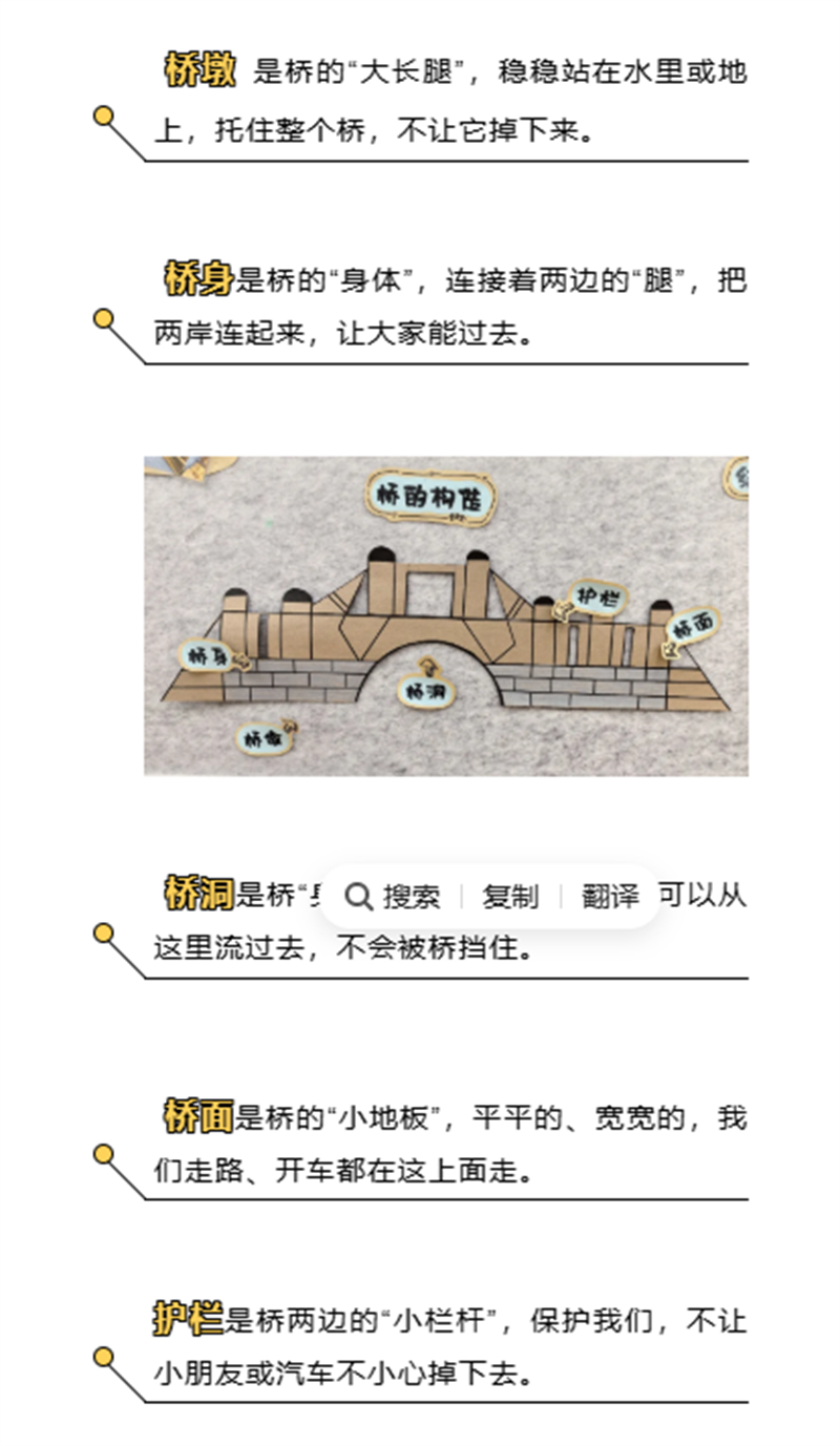 之后借助“纸片模拟桥墩支撑桥面”的趣味实验,幼儿直观感知到增设支撑结构对提升桥梁稳固性的重要性。结合图片与视频解析,幼儿进一步明确:完整的桥由桥墩、桥身、桥洞、桥面、护栏五部分组成,且桥面需保证平整、高度适宜,才能满足安全通行需求。
