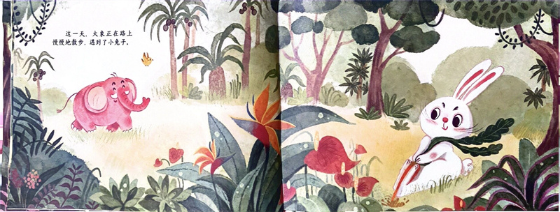 有一天,大象正在路上慢慢地散步,遇到了小兔子。