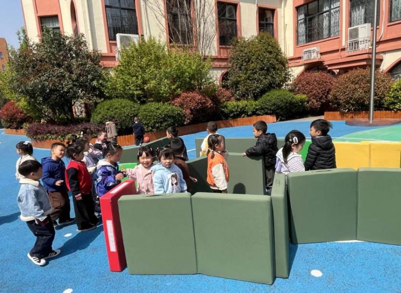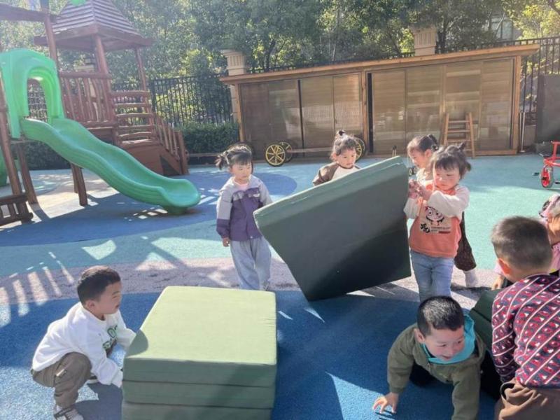 观察发现,游戏初始,孩子们仅把垫子当作沙发或床,进行简单爬行。随着游戏深入,他们开始创造性地组合折叠与平铺垫子,玩出新颖花样。全程老师未作干涉,孩子们凭借丰富的想象力与创造力自主探索,在互动游戏中尽情享受着自发创造的欢乐时光。