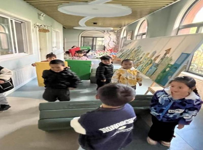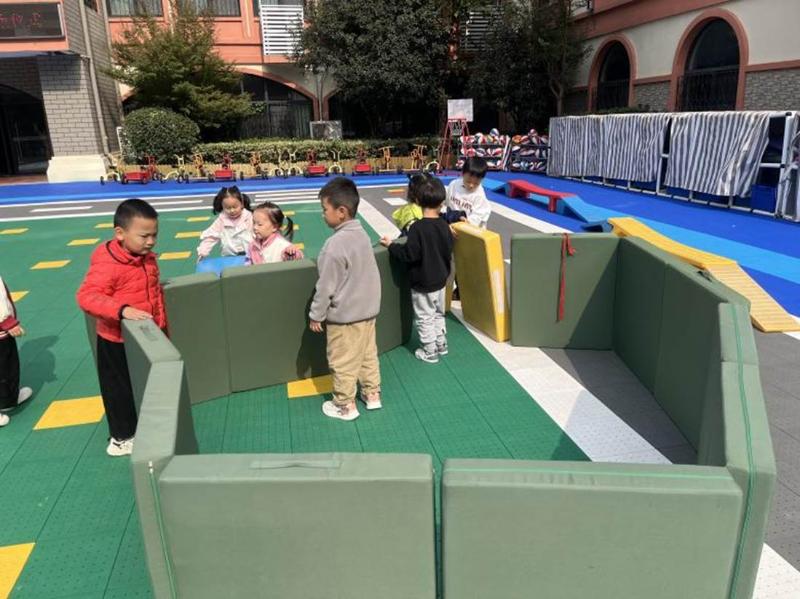 在子裕提议下,孩子们拼接垫子,有人扶着垫子保持稳定,有人用小物件装饰“房子”外观。一番努力后,简易又童趣的“垫子房子”搭建好啦。