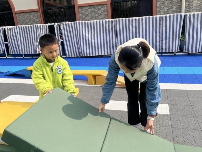 随着游戏的持续推进,幼儿在玩滑滑梯游戏时遇到了一个小麻烦:滑滑梯太矮了怎么办?一名幼儿拿来垫子继续往上垒高。随后又发现滑下来的时候垫子会掉落。于是,老师和幼儿再次开启了一次次新的尝试与探索。