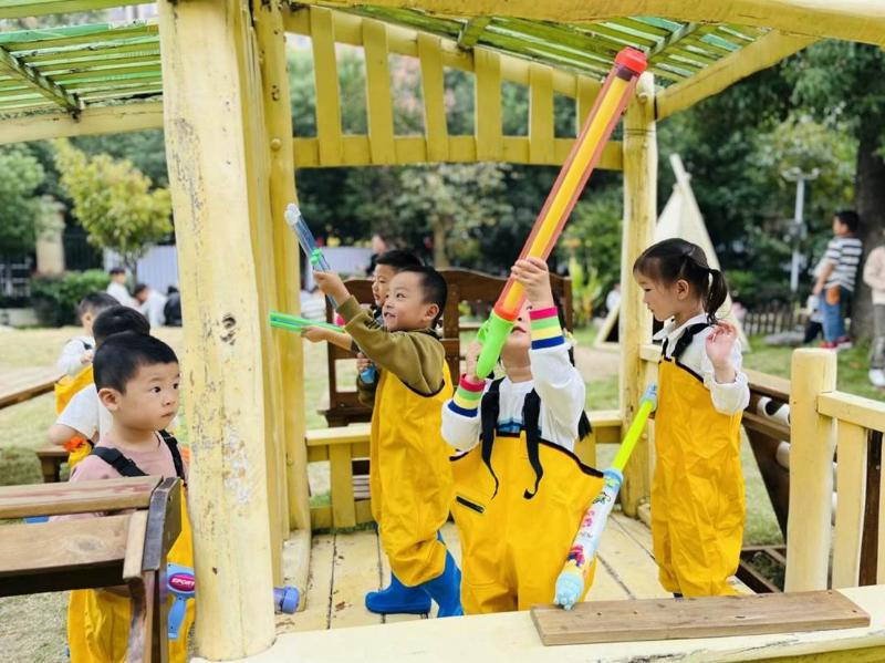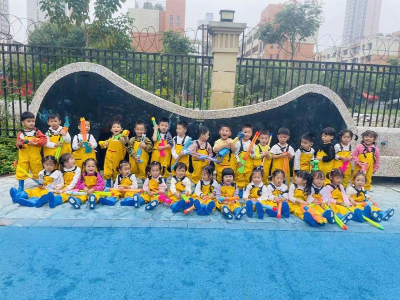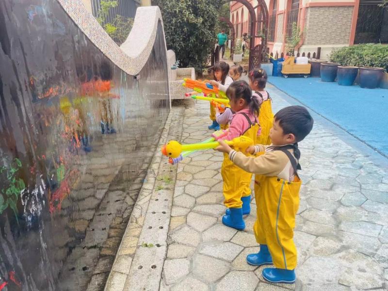 随着欢快的音乐响起,小朋友们手中的水枪纷纷“火力全开”,一串串水柱喷射天空,身穿五彩雨衣的孩子们在操场上奔跑着、嬉闹着,相互喷射着,尖叫声、欢呼声、呐喊声此起彼伏,幼儿园瞬间变成了欢乐的水世界,每个孩子脸上都绽放着灿烂的笑容。