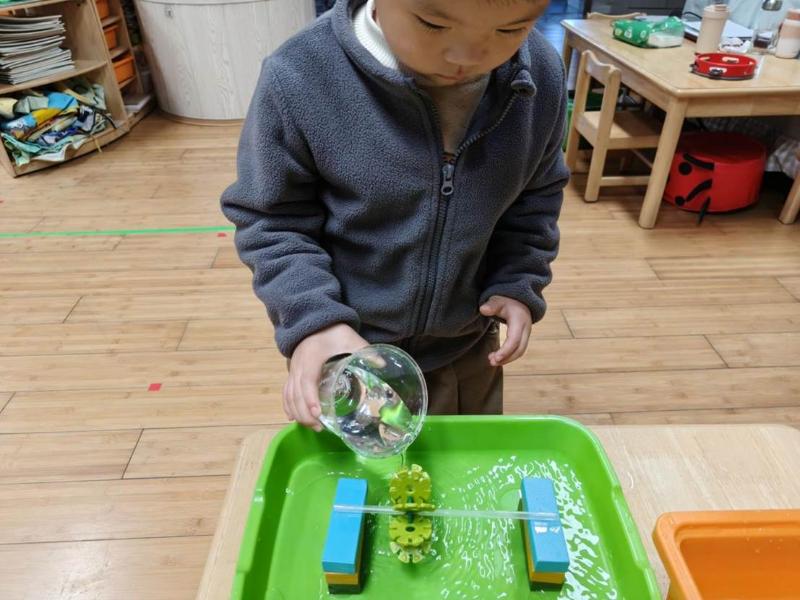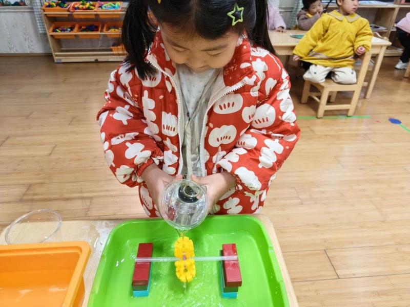 孩子们你争我抢地尝试,有的发现从高处倒水,风车转得更欢;有的把风车叶片换个角度,发现转动的速度也变了。