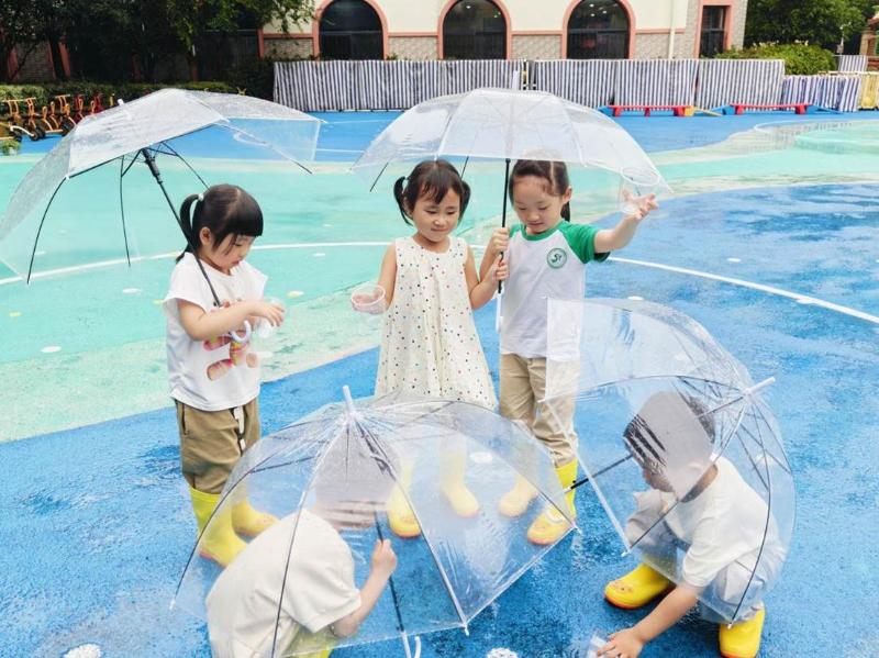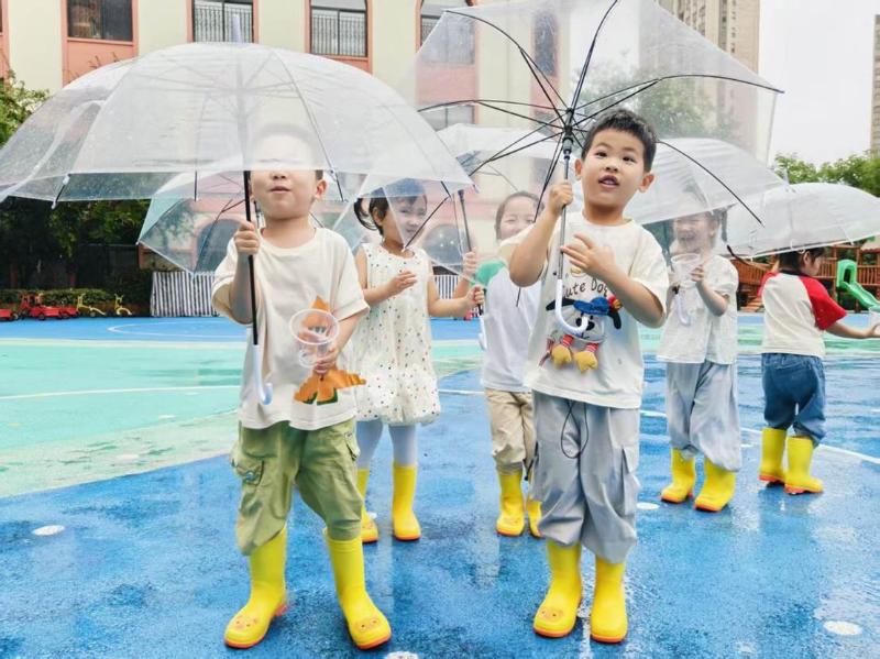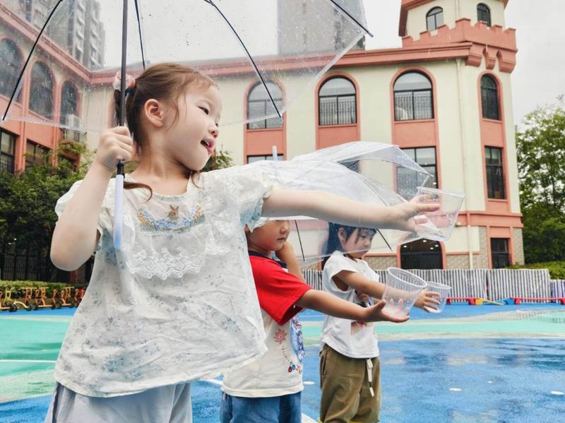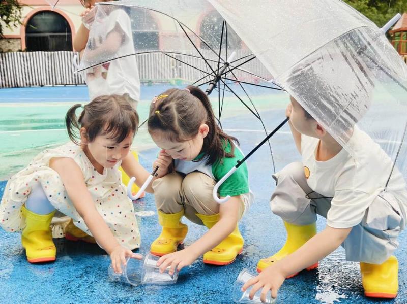 穿上雨衣、雨靴,撑着小雨伞,一个个都迫不及待地想和“小雨滴”一起玩耍。用手接一接雨水,感受小雨滴落在手上的触觉;用小脚踩一踩水坑,感受雨水溅起来的快乐;在雨里一起变成小鱼游啊游,感受和好朋友一起游戏的愉悦......孩子们在雨中玩得不亦乐乎。