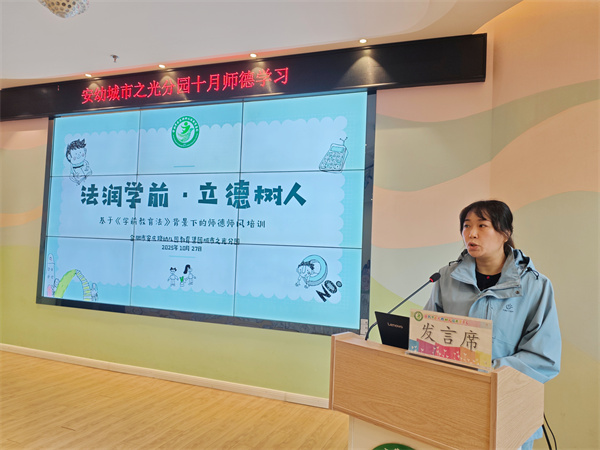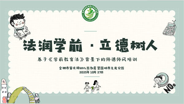 为进一步加强幼儿园师德师风建设,2025年10月27日,合肥市安庆路幼儿园教育集团城市之光分园组织开展了以“法润学前,立德树人”为主题的全体教职工师德师风专题培训。本次培训旨在引导教师深刻理解法律法规对学前教育的要求,争做新时代“有法度、有温度”的幼教人。