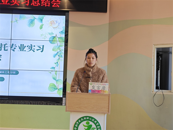 最后,袁媛副书记对本次实习做总结发言。她对同学们在实习期的表现给予了高度评价,并充分肯定了指导教师的辛勤付出。她表示,在实习期间,大家成功完成了从理论到实践的跨越,为园所注入了新的活力。袁媛副书记还特别强调了师德在幼教工作中的核心地位。她表示:教育之道,德为先。作为幼儿教师,不仅是知识的传递者,更是孩子品格成长的引路人和守护者。希望大家始终怀揣仁爱之心,恪守职业操守,以高尚的师德浸润童心,用言传身教为孩子们的成长奠定坚实根基。她希望大家能珍视这段经历,坚守对幼教事业的热爱,将收获转化为职业发展的坚实基础在未来的职业道路上砥砺前行,成长为幼教事业的中坚力量。