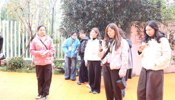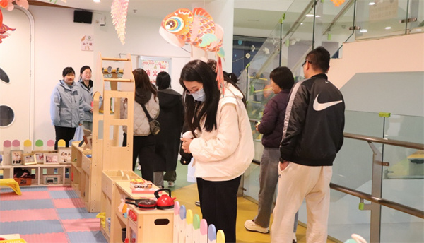 宣传片观看结束后,在柳凤、曹艳浈两位位教师的引导下,嘉宾们分组沉浸式观摩园区环境。户外游戏区的自主探索材料,步入操场,映入眼帘的是大班孩子们用碳化积木搭建的 “长城”—— 长短不一的积木被精准拼接成蜿蜒的城墙,部分区域还细心搭建了 “烽火台”;班级活动室的生活化区域创设,小班的娃娃家、中班的小花店、大班的黄梅戏台,走廊里充满童真的幼儿作品墙;兼具教育性与趣味性的植物角,每一处细节都渗透着 “以儿童为中心” 的教育思考。嘉宾们不时驻足观察、拍照记录,与引导教师深入交流环境创设背后的教育逻辑,对园区将游戏精神与生活教育融入环境的巧思给予高度评价。