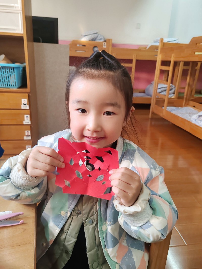 同时我们鼓励幼儿回家后与爸爸妈妈一起探讨窗花的剪裁方法,共同尝试剪出漂亮的窗花,记录亲子共剪的温馨瞬间。亲子共剪不仅加深了幼儿对窗花剪裁技巧的理解与记忆,还有利于幼儿在亲子互动中进一步了解剪纸艺术。