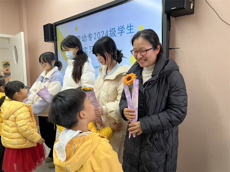 欢送会上,孩子们为实习生老师们送上亲手制作的纪念礼物,现场洋溢着温暖的氛围。