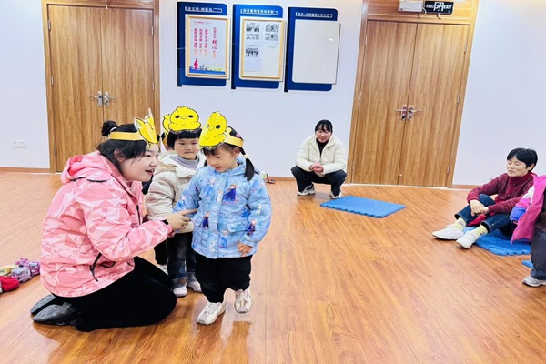 在“小鸡学本领”环节,刘老师示范踮脚走路、弯腰啄食的动作,家长们牵着宝宝的手耐心模仿,稚嫩的脚步和认真的模样相映成趣。