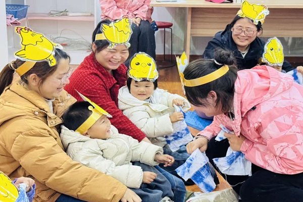 2025年12月17日下午3点,合肥市荣城幼儿园教育集团在社区活动室开展了一场热闹的“星火邻里”社区早教活动——“萌趣小鸡总动员:踏出俏皮的啄食舞步” 亲子快乐律动舞会。本次活动由幼儿园党支部书记、总园长吴庆莉统筹部署,荣幼党支部党员、团员教师化身志愿者全程贴心陪伴,活动联合丽水社区、菱湖社区及庐阳区刘晓艳名师工作室共同打造,吸引多组2-3岁幼儿家庭参与。活动以“音乐律动”为核心,将小鸡模仿、啄食游戏等趣味身体动作与亲子协作深度融合,为参与家庭带来一场充满欢声笑语的亲子律动之旅,切实把优质早教服务送到居民身边。