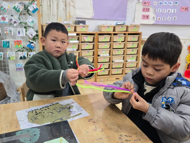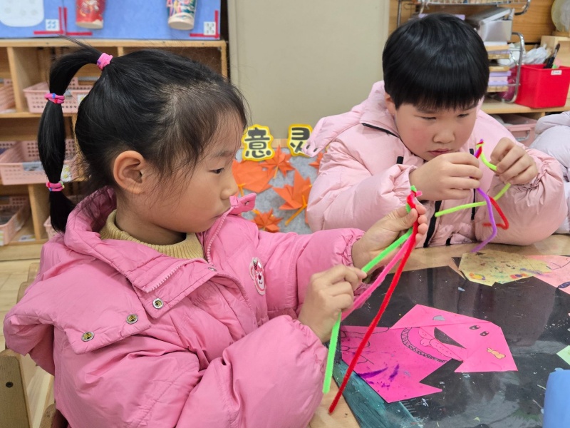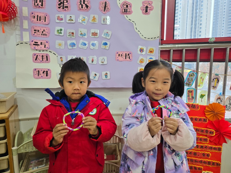 活动中,孩子们专注地拿着红、绿、粉、紫等各色扭扭棒,小手灵活地弯折、缠绕、穿插。有的孩子认真琢磨编织的纹路,有的两两合作互相交流技巧,还有的大胆发挥想象,给手环加上花朵、星星等创意装饰。从最初的生疏尝试,到逐渐掌握编织要领,孩子们的小脸上满是专注与认真,指尖的扭扭棒在他们手中渐渐变成了独一无二的手环。