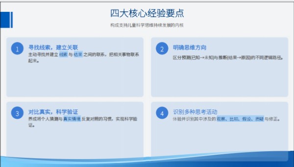 随后,由主持人陈天竹带领大家深入研读《学前儿童科学学习与发展核心经验》第四章预测与推断。学习的过程中,陈园长围绕“预测与推断”在幼儿科学学习中的核心价值展开解读,结合幼儿年龄特点与认知规律,剖析了预测的类型、推断的逻辑路径,以及教师在活动中引导幼儿进行预测与推断的有效策略。同时,陈园长结合幼儿园教学实例,分享了如何在观察、实验等科学活动中,为幼儿搭建思维支架,鼓励幼儿基于已有经验大胆预测、通过动手操作验证猜想、在交流讨论中梳理推断思路。