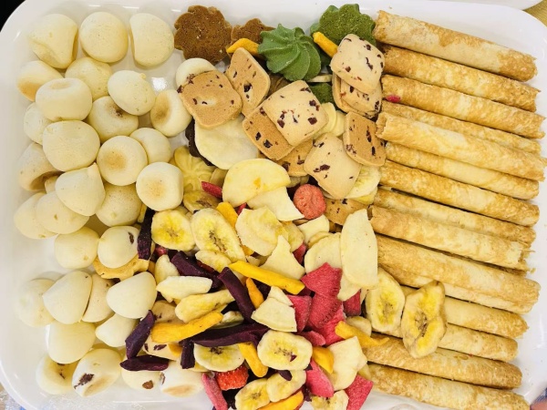 清晨,幼儿园的食堂工作人员们早早来园准备食材,将“健康营养”与“色香味形”完美融合。从食材的严格筛选到食谱的科学搭配,从菜品的精心烹制到创意摆盘,每一个环节都凝聚着对孩子们的关爱。金黄酥脆的鳕鱼排、软糯香甜的美味虾饺、清爽可口的桑叶片、造型可爱的卡通面点,还有蓬松暄软的花式糕点,十余种美食整齐陈列,不仅满足了孩子们的味蕾需求,更成为一道赏心悦目的视觉风景,激发着孩子们的进食兴趣 。