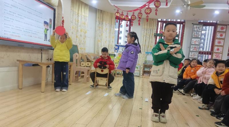 大班年级组以“出行安全”为重点,精心设计了互动体验活动。孩子们化身为“小司机”和“小乘客”,在模拟乘车区学习正确系好安全带,并牢记“小手小脑袋不伸窗外”的安全规则。在“斑马线闯关”游戏中,孩子们通过红绿灯情景演练,掌握“红灯停、绿灯行”的交通规则;面对“陌生人零食诱惑”的考验,他们坚定拒绝,齐声回应:“不跟陌生人走!”寓教于乐的形式让安全知识深入童心。