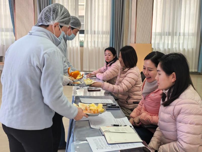 实操考核更是紧张有序,“桌面消毒”环节中,她们严格遵循“清—消—清”的标准流程,从配比消毒液到规范擦拭,每一个步骤都精准到位,用严谨的操作筑牢孩子们的健康防线。“水果削切”环节里,保育老师们规范佩戴手套与头套,动作娴熟又细致,将水果处理得既安全卫生又造型美观,尽显专业风采。