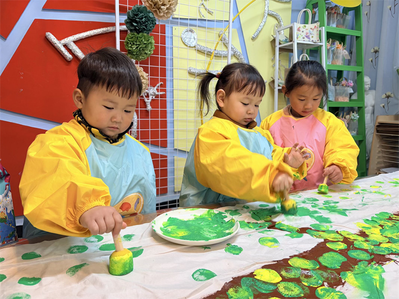 “植”一抹青绿,静待花开。小班幼儿化身“春日小画家”,在老师的带领下开展百米画轴拓印活动。孩子们手持海绵戳,蘸取缤纷颜料,在长长的画轴上轻轻拓印,用稚嫩的笔触勾勒春日生机,共同为幼儿园装点出一片充满童趣的绿意画卷。