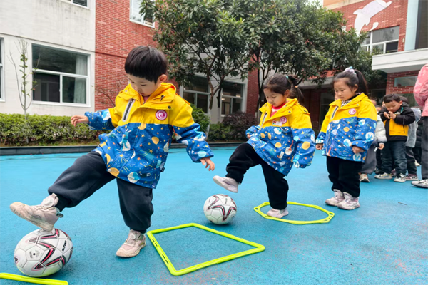 活动中,老师们全程陪伴在孩子身边,用生动的语言讲解游戏规则,手把手示范动作技巧,鼓励孩子们大胆尝试。孩子们化身小小足球运动员,迎着阳光追着足球跑,勇敢运球,操场上满是孩子们的欢声笑语,一张张笑脸在阳光下格外灿烂。