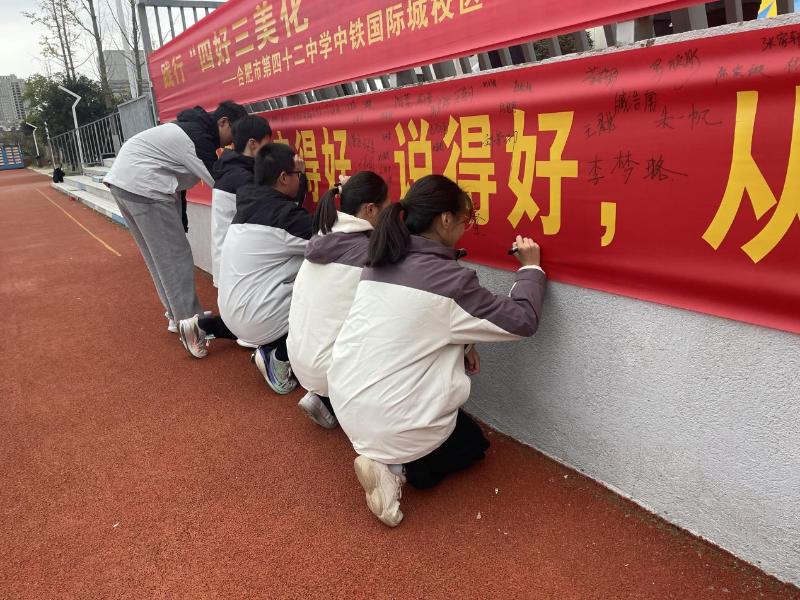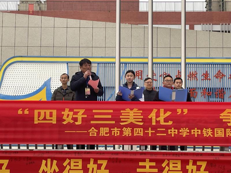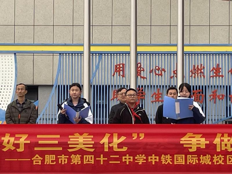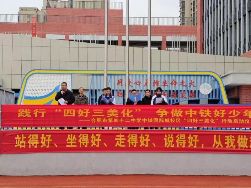 清晨的操场上,五星红旗在微风中猎猎舒展,合肥市第四十二中学中铁国际城校区全体师生身着整齐校服,以饱满的姿态,迎来“四好三美化”学生文明素养培育专项行动启动仪式。
