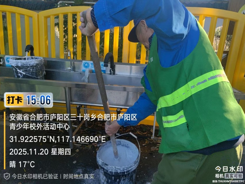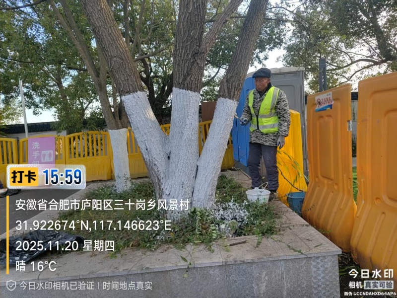 养护现场一派忙碌景象。专业养护人员首先对树干进行细致清理,刮除老树皮、虫卵和杂物,确保涂白剂能均匀附着;随后按照比例精准调配涂白剂,保证浓度适中、效果达标。绿化人员手持毛刷,小心翼翼地从树干基部开始,由下而上均匀涂抹,力求涂白高度一致、厚薄均匀,不遗漏任何一处缝隙。尽管初冬天气微凉,但大家热情不减,递工具、搅药剂、专注涂抹,分工协作、默契配合,全身心沉浸在护绿行动中。
