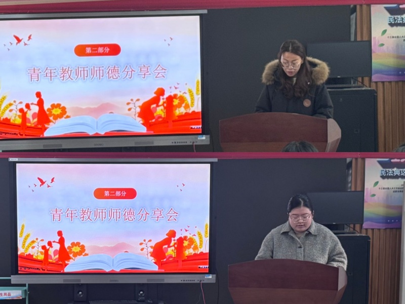 在“我的育人故事”分享环节,两位青年教师结合自身从教经历,讲述了在践行师德道路上的思考、探索与成长。彭金雯老师回顾了从教初期遇到的课堂管理难题,分享了自己通过坚持课后反思、虚心请教前辈、大胆尝试多元教学策略,最终突破瓶颈、赢得学生喜爱的过程。汪佩瑶老师则动情地叙述了她从入职以来的心路历程,在实践中不断调整教育方法,深刻体会到“教育无小事,事事需用心”的真谛。两位教师的分享朴实真挚、细节饱满鲜活,生动展现了青年教师将师德规范转化为日常教育行为的实践轨迹,引发了在场教师的强烈共鸣。