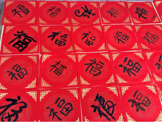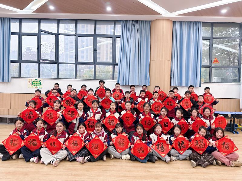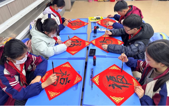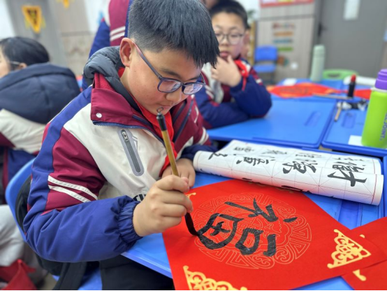 活动现场,红纸铺展,墨香飘散。在曾老师的悉心指导下,同学们纷纷提起毛笔,蘸墨挥毫。他们神情专注,一笔一划认真书写,横竖撇捺间尽显对传统书法艺术的初探与热情。一幅幅充满童真又寓意吉祥的春联和“福”字在笔下诞生,虽笔触稚嫩,却饱含着对新年的诚挚祝福与美好憧憬。融融暖意与欢声笑语充盈教室,节日的喜庆气氛格外浓厚。