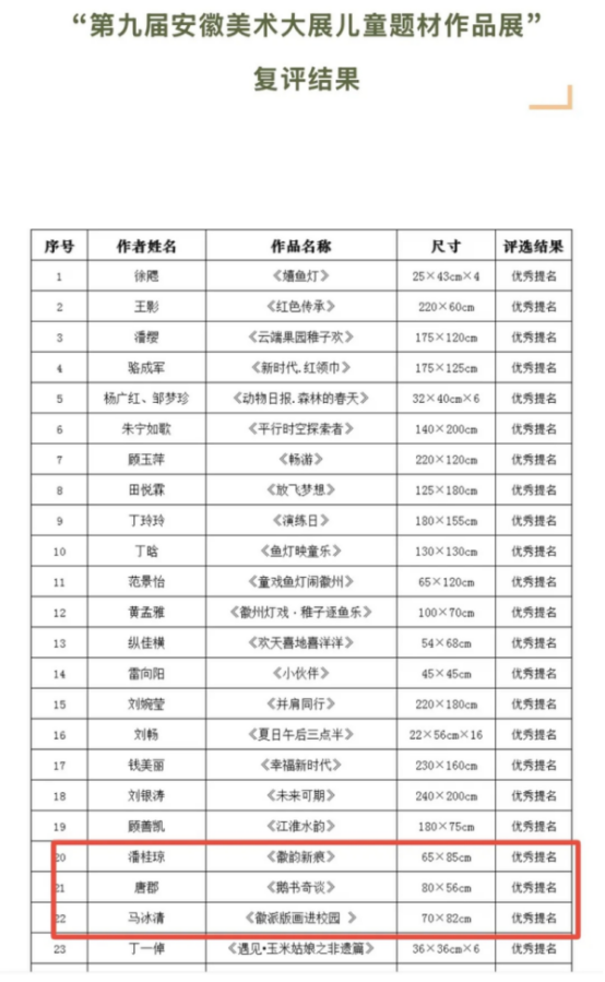 近日,由安徽省文学艺术界联合会、安徽省美术家协会联合主办,安徽省美协少儿美术艺委会与公麟美术馆共同承办的“第九届安徽美术大展儿童题材作品展”圆满完成评审工作。在这场全省美术界的儿童题材盛会中,庐阳区美术教师团队表现尤为亮眼——潘桂琼、马冰清、唐郡、徐畅四位教师的作品经过多轮评审成功入选。