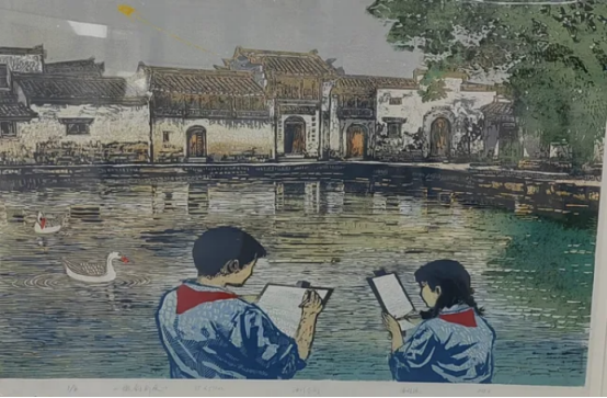 逍遥津小学潘桂琼老师的版画作品《徽韵新痕》(65×85cm),以刀为笔、以版为纸,将徽州马头墙的飞檐翘角与现代学生的绘画背影巧妙融合。作品中细腻的线条不仅还原了徽州建筑的肌理之美,更通过孩童在认真写生画画的场景,呼应了庐阳区“地域文化美育课程”的教学理念,展现传统文化与现代教育碰撞出的新活力。
