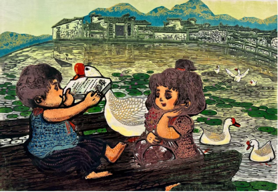 逍遥津小学唐郡老师的版画《鹅书奇谈》(80×56cm),则以充满童趣的想象力诠释了“传统文化童趣化教学”的庐阳思路。作品以“咏鹅”的典故为灵感,将白鹅化作“驮着书卷的精灵”,孩童伴着白鹅读书的画面充满动感,既传递了传统文化的魅力,又贴合儿童的审美视角。