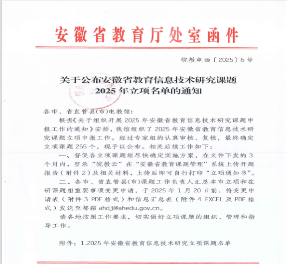 近日,由南门小学冯春梅老师和六安路小学中铁国际城校区的方玲玲老师申报的《AI赋能小学音乐课堂戏剧游戏教学策略研究》成功获批2025年度安徽省教育信息技术研究课题,立项编号[AH2025025]。该课题是继刘双宁、吴启恩省级课题《基于智慧课堂的中小学戏剧教学策略研究》立项后的又一教科研成果。
