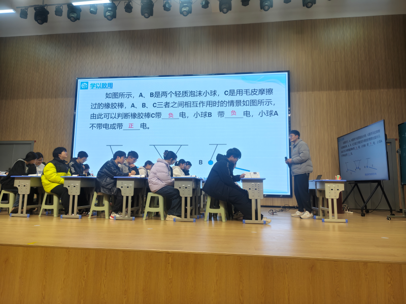 首先,庐阳中学临泉分校的张洪浩老师首先执教了课例《电荷》。他通过巧妙的实验设计和生动的讲解,将抽象的电荷知识具象化,引导学生深入探索电世界的奥秘,课堂氛围活跃,充分激发了学生的学习兴趣。