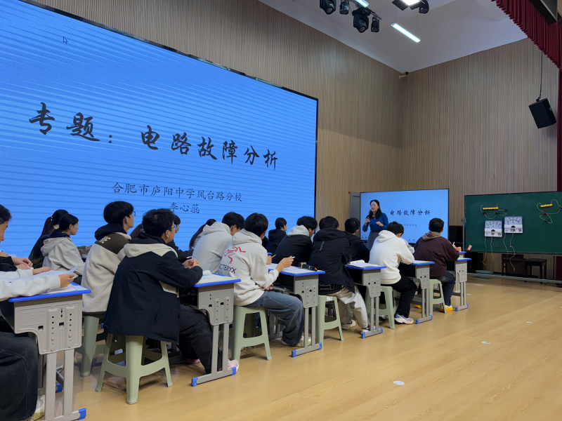 随后,庐阳区石信天物理名师工作室成员、合肥市庐阳中学凤台路分校的李心蕊老师展示了课例《电路故障》。李老师的课堂逻辑清晰,层层递进,她引导学生像医生诊断病情一样,利用所学知识、结合实验器材演示,分析并排除电路中的故障,培养学生分析问题和动手实践的能力,展现了扎实的教学功底和创新的教学理念。